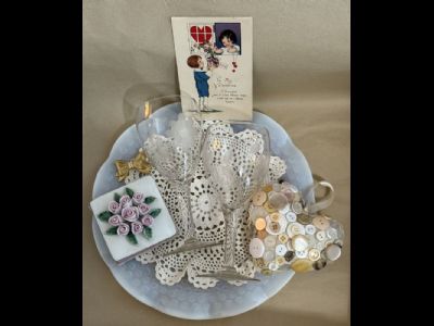 This Charming Treasures Bundle Box contains a beautiful 1940s Anchor Hocking moonstone hobnail cake plate. crocheted doily, a pair of lovely etched crystal wine goblets, rosebud laden porcelain trinket box, sweet gold-tone crystal brooch, and a hand-made button heart ornament, topped with an authentic Valentine's Day postcard, which will surely sweeten the special occasion!